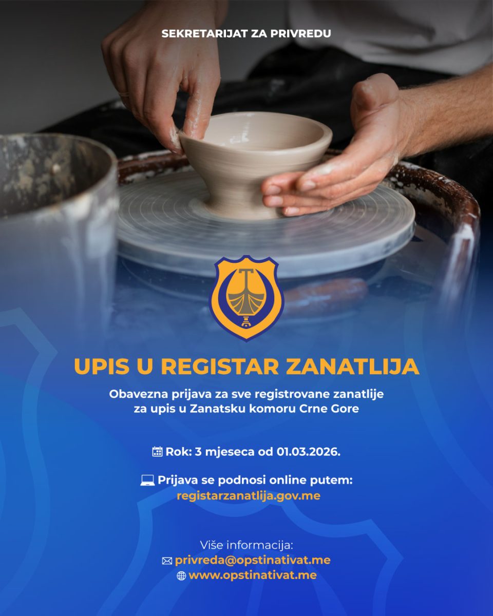 Shodno izmjenama i dopunama Zakona o zanatstvu (“Sl. list CG” br. 54/09, 64/09, 40/11, 84/24 i 89/25) usvojenim u julu 2025. godine zanatlije su dužne da u roku od tri mjeseca od dana uspostavljanja Registra (01.03.2026. godine) podnesu prijavu za upis Zanatskoj komori Crne Gore.