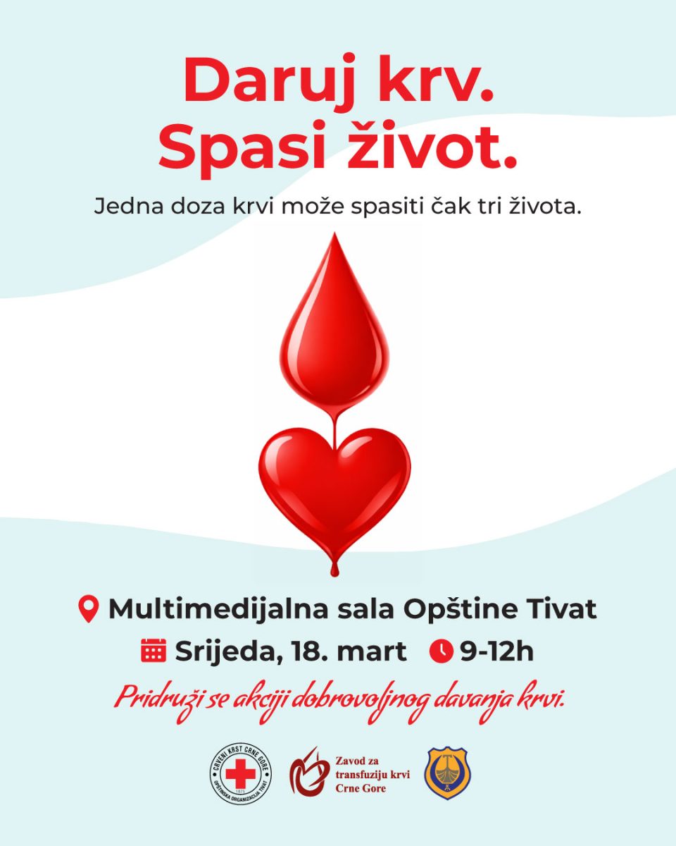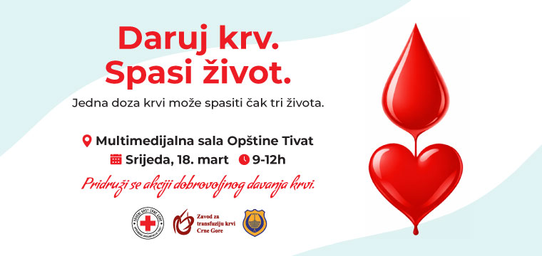 Opština Tivat i Crveni krst Tivat u saradnji sa Zavodom za transfuziju krvi Crne Gore organizuju tradicionalnu akciju dobrovoljnog davalaštva krvi u srijedu, 18. marta od 9–12h u multimedijalnoj sali Opštine Tivat.