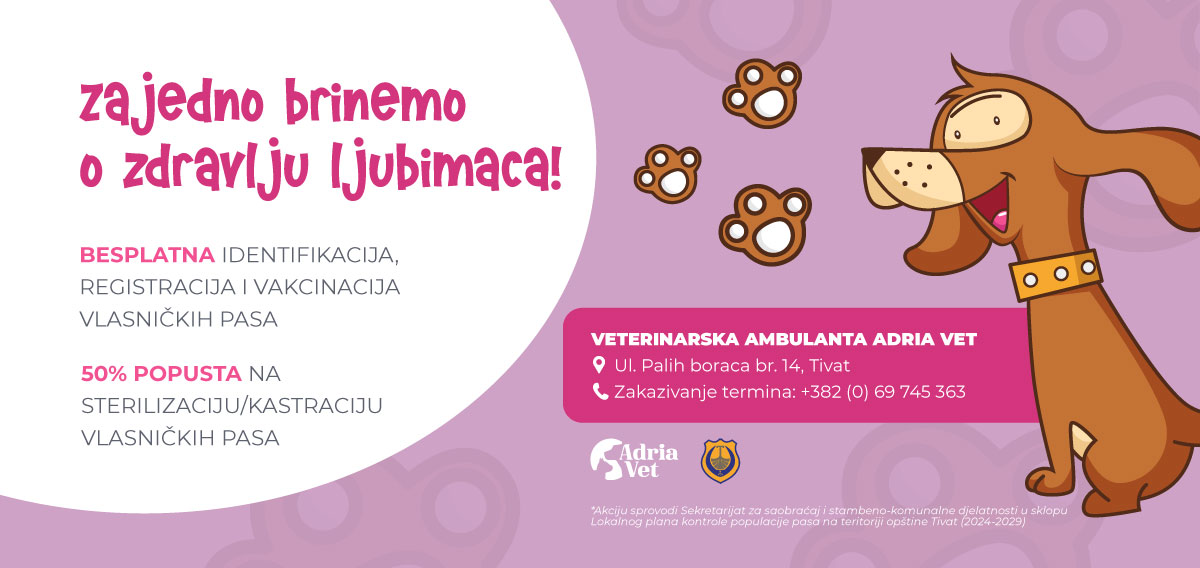 Opština Tivat u saradnji sa veterinarskom ambulantom “Adria Vet” sprovodi akciju besplatne identifikacije, registracije i vakcinacije protiv bjesnila, uz obezbjeđen popust od 50% za sterilizaciju/kastraciju vlasničkih pasa, čiji vlasnici imaju prebivalište na teritoriji opštine Tivat.