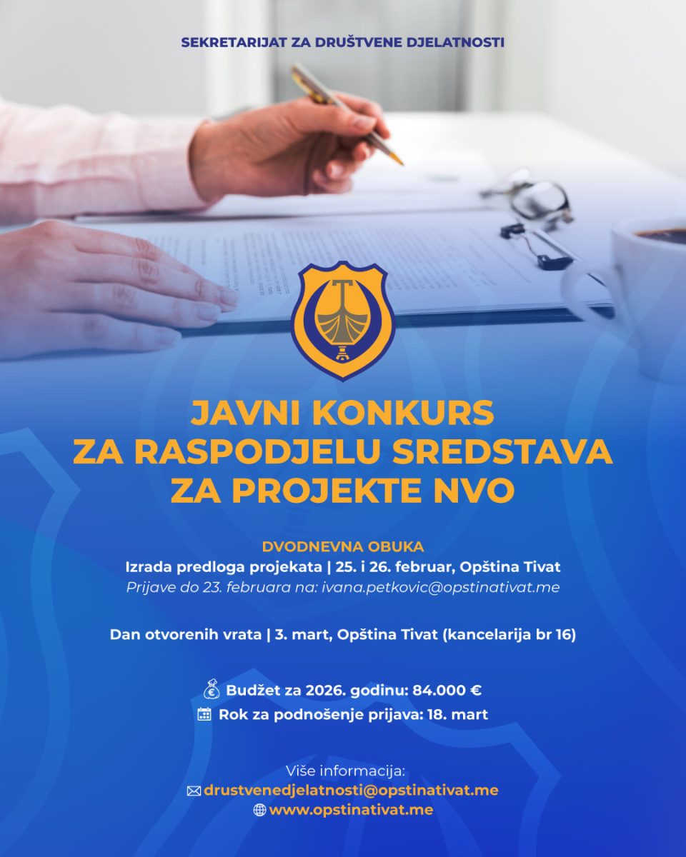Na osnovu člana 17 Odluke o kriterijumima, načinu i postupku raspodjele sredstava nevladinim organizacijama („Službeni list Crne Gore - opštinski propisi", br. 32/18), Komisija za raspodjelu sredstava nevladinim organizacijama objavljuje Javni konkurs za raspodjelu sredstava za projekte nevladinih organizacija za 2026. godinu.