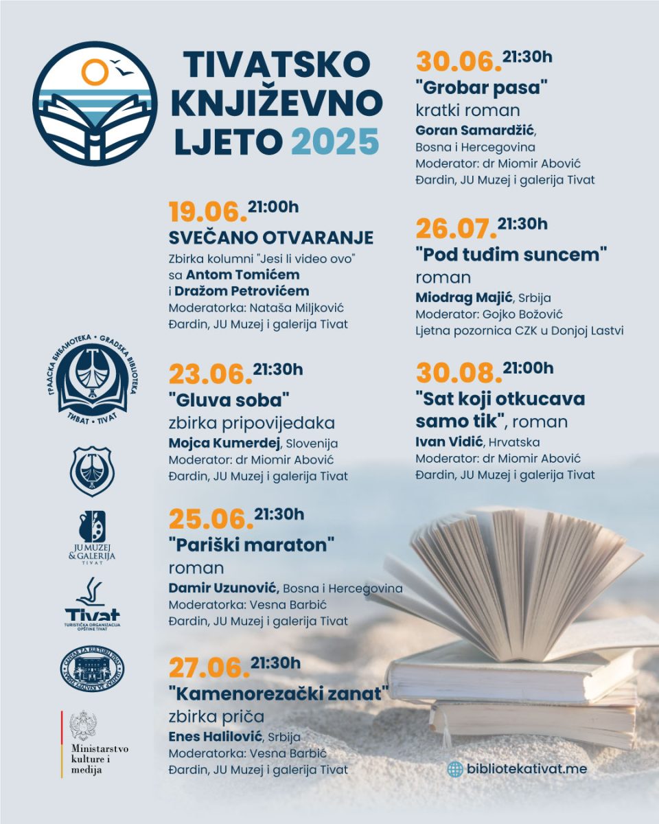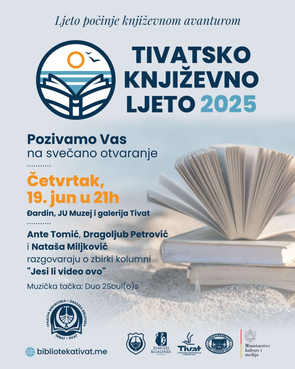 Detalji programa Tivatskog književnog ljeta 2025- najave kao i video zapisi svih događaja, zainteresovanoj publici biće dostupni na sajtu bibliotekativat.me i Viber zajednici biblioteke.