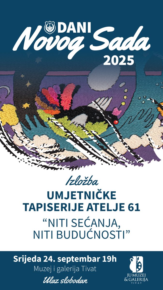 Ovaj kulturni događaj iza kojeg stoji Grad Novi Sad i Kulturni centar Novog Sada počeće u srijedu /24.09./ izložbom umjetničkih tapiserija “Ateljea 61” pod nazivom “Niti sjećanja, niti budućnosti”, u JU Muzej i galerija Tivat od 19h.