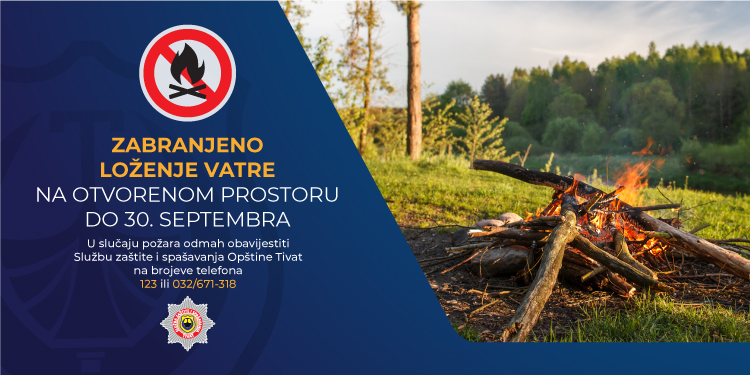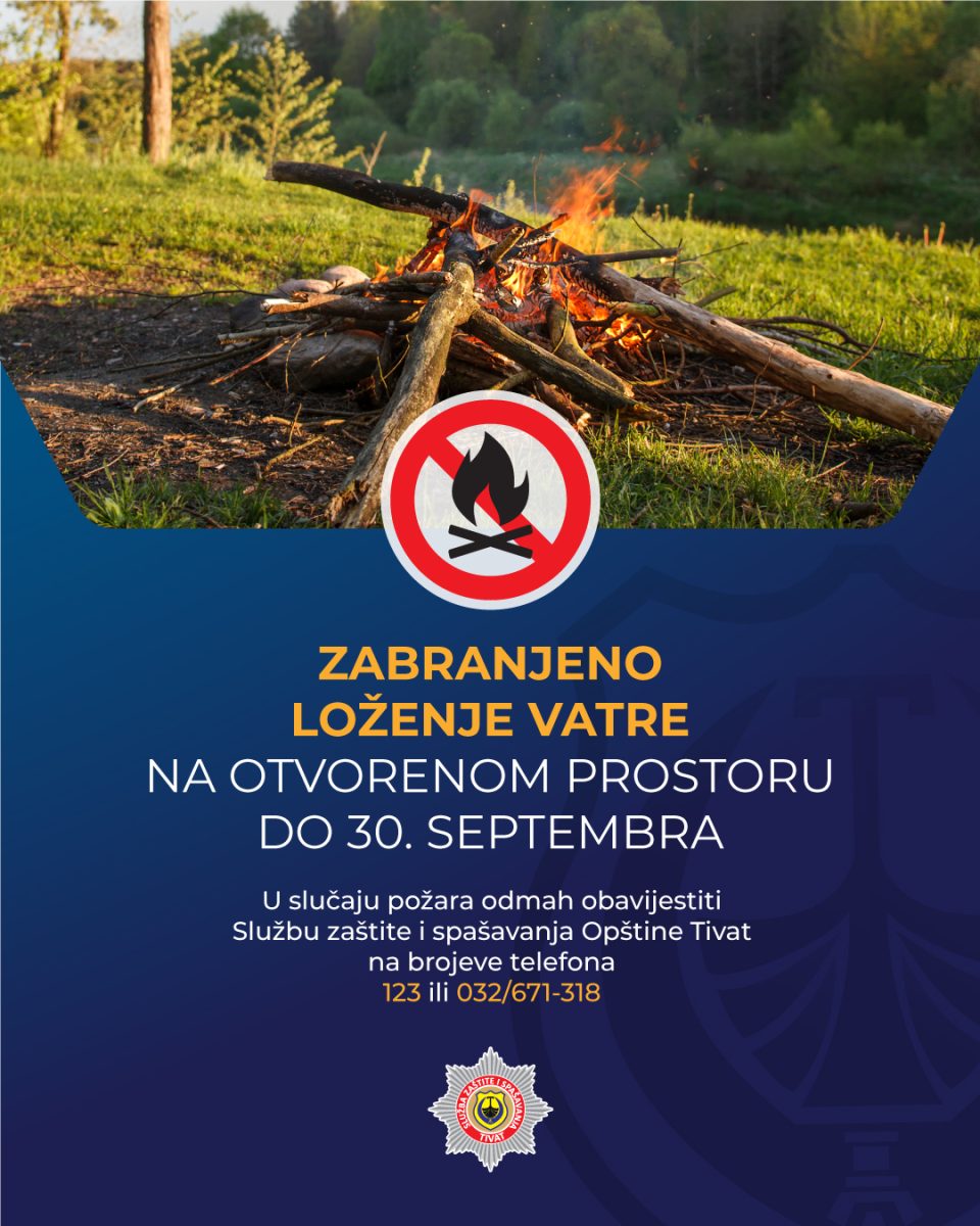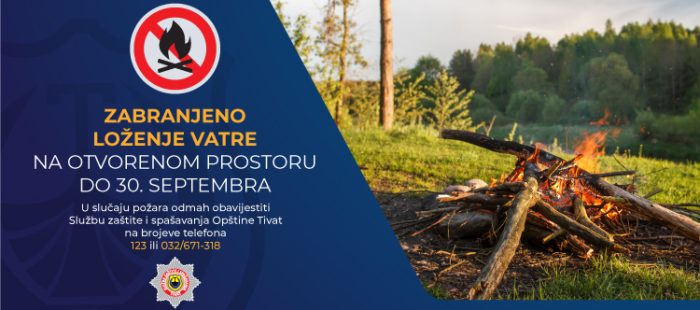Predsjednik Opštine Tivat Željko Komnenović donio je naredbu kojom se zabranjuje loženje i paljenje vatre na otvorenom prostoru na teritoriji opštine od 15. juna do 30. septembra 2025. godine.